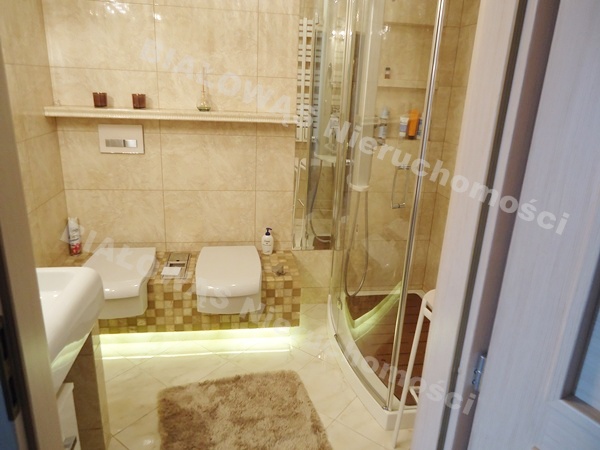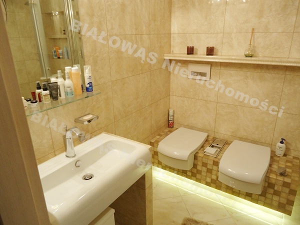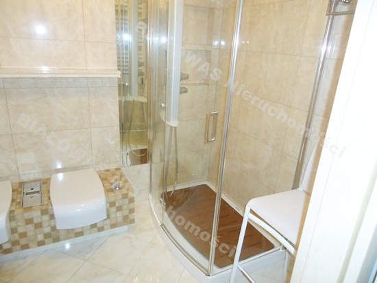Łazienka z prysznicem oraz wc z bidetem, osobno toaleta dla gości.