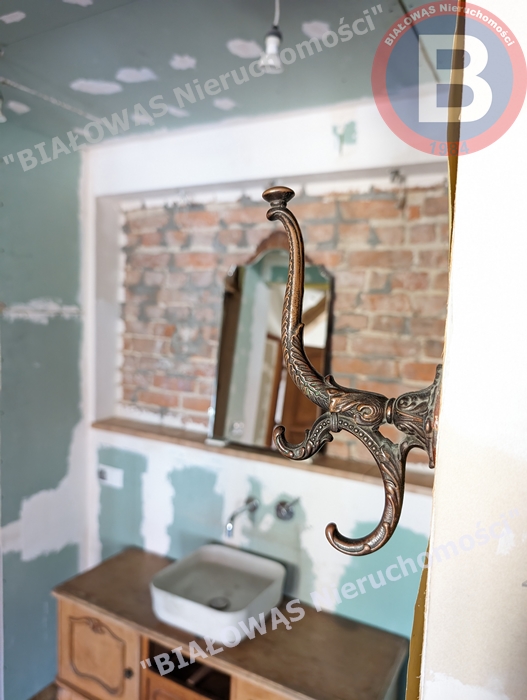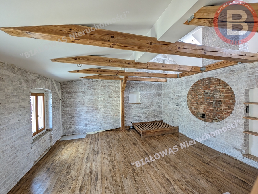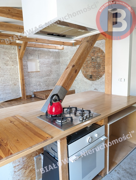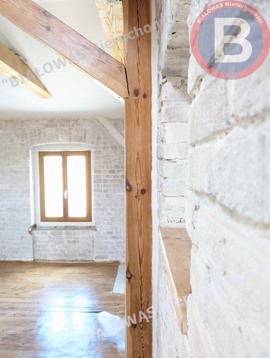 Mieszkanie ma wspaniały klimat, celowo zachowano odsłonięte drewniane belki , filary i legary .